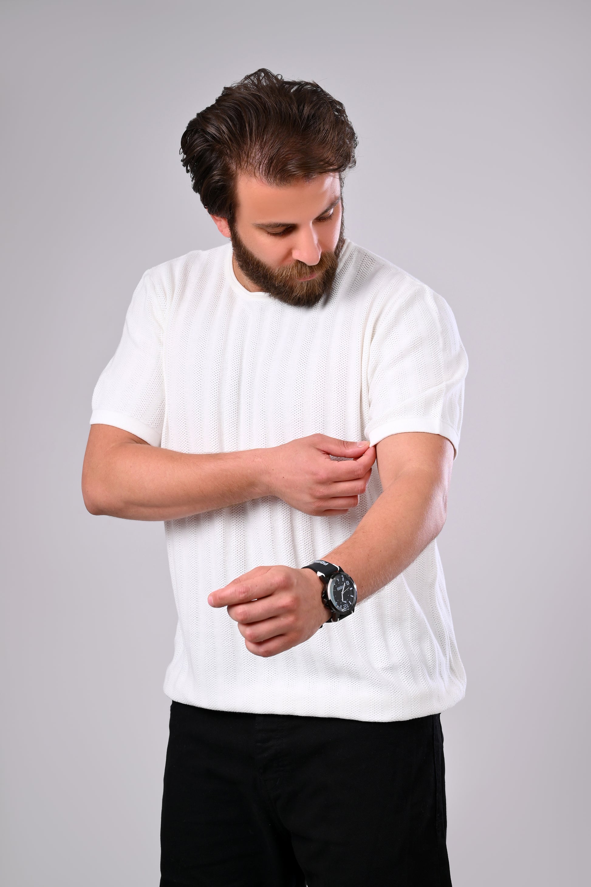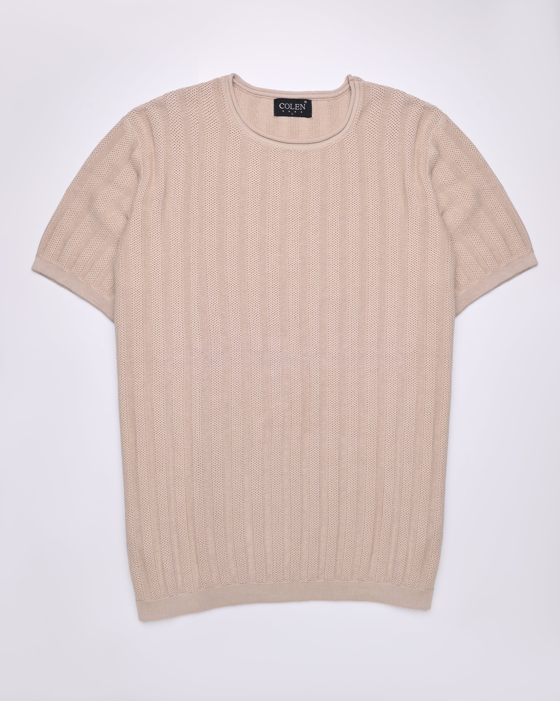 حافظ على انتعاشك وأناقتك مع هذا التيشيرت المحبوك المصنوع من القطن 100% بأكمام قصيرة. مصمم بملمس ناعم يسمح بمرور الهواء مع ضلوع عمودية رقيقة، ليمنحك مظهرًا أنيقًا وعصريًا مثاليًا للأيام غير الرسمية أو نزهات الصيف المريحة. خفيف الوزن ومريح بشكل طبيعي، هذه القطعة أساسية يومية، مصممة للطقس الدافئ وسهلة الارتداء على طبقات.